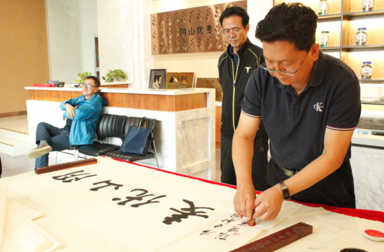 隨后,大家又來到燕麥博物館,感受燕麥文化、體驗燕麥產(chǎn)品的同時,并現(xiàn)場目睹書法名家張曉華老師的揮毫潑墨。孟才介紹,中國燕麥的市場份額在100億元以上,裸燕麥起源于中國,但是國內(nèi)燕麥深加工所用的原糧90%是進口皮燕麥,只有10%是國產(chǎn)裸燕麥,主要原因是國產(chǎn)裸燕麥多采用傳統(tǒng)旱作耕作方式,人工除草,有機種植,不使用除草劑、農(nóng)藥、化肥等,畝產(chǎn)較低。但是,也正因如此裸燕麥的口感更好、質(zhì)量更佳且蛋白質(zhì)、脂肪、β-葡聚糖等營養(yǎng)成分均高于皮燕麥。得天獨厚的資源優(yōu)勢是陰山優(yōu)麥建企立身的根基和市場競爭的底氣,產(chǎn)品全部采用優(yōu)質(zhì)的國產(chǎn)裸燕麥就是陰山優(yōu)麥的核心競爭力!
